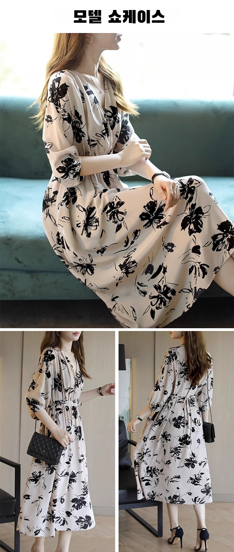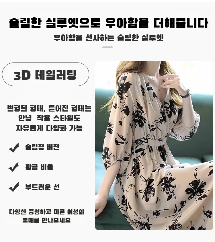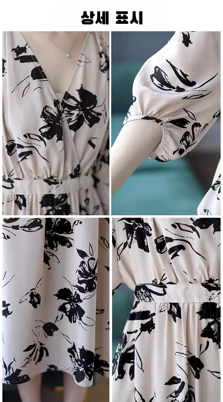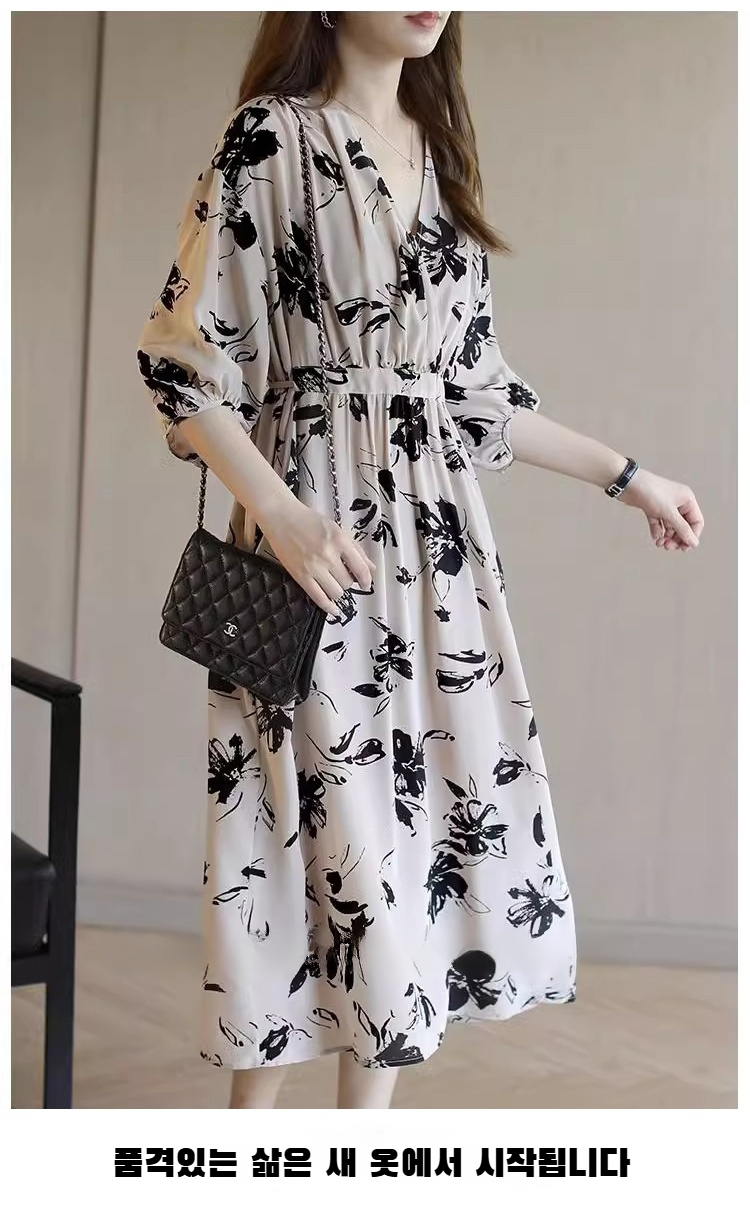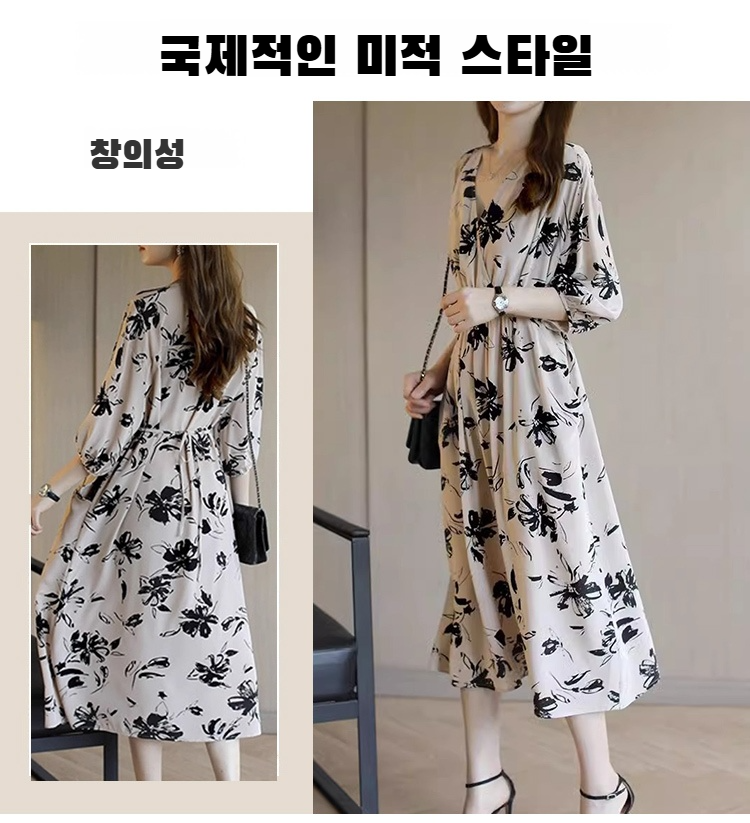 【핫세일】 V넥 원피스 여성 봄/여름 기질 슬림 미디 길이 스커트 허리 플리츠 원피스